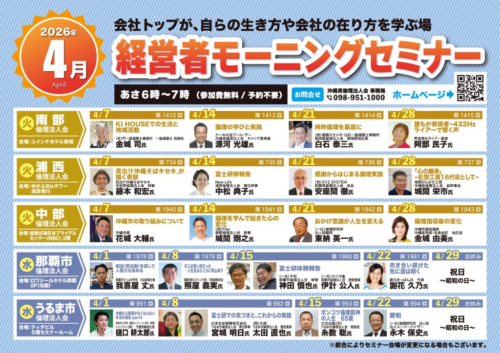 多くの成功者は朝の時間を有効に活用しています。朝型の生活習慣を体得するとともに各界で活躍している方々の講話を通し、倫理経営の心構えと秘訣を学ぶことができます。また、経営者同士の交流・情報交換の場にもなっています。朝のモーニングセミナー以外にも多くのイベントを開催しておりますので、自己啓発に人脈作りに、是非ご参加ください!