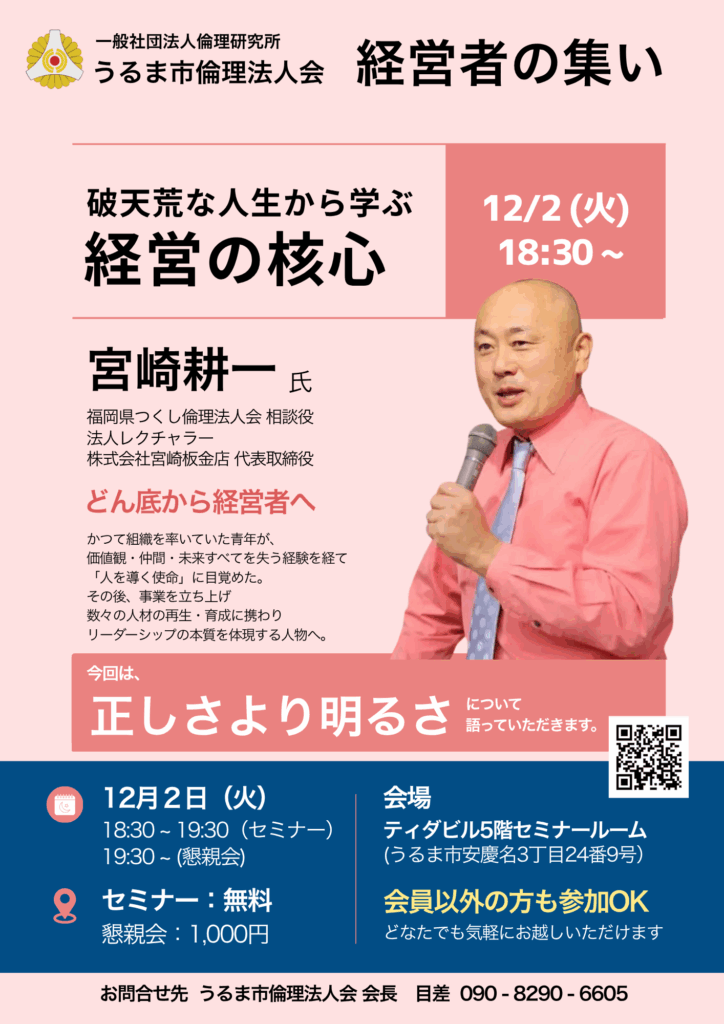 当日は、福岡県つくし倫理法人会相談役で、宮崎板金代表の宮崎耕一さんを講師に招き、