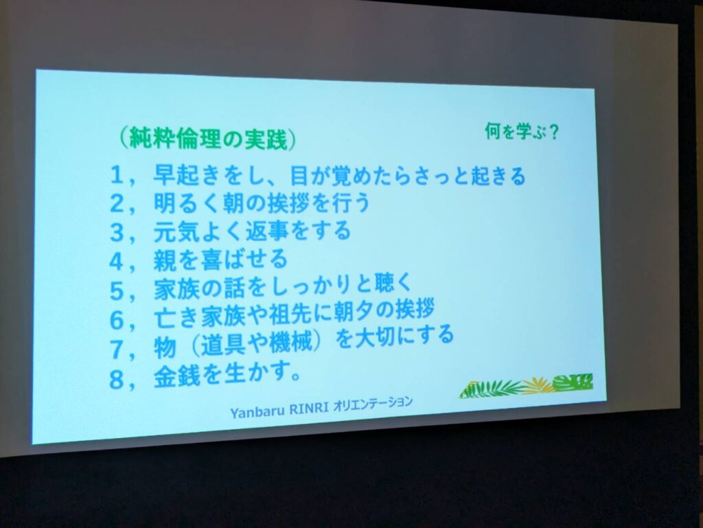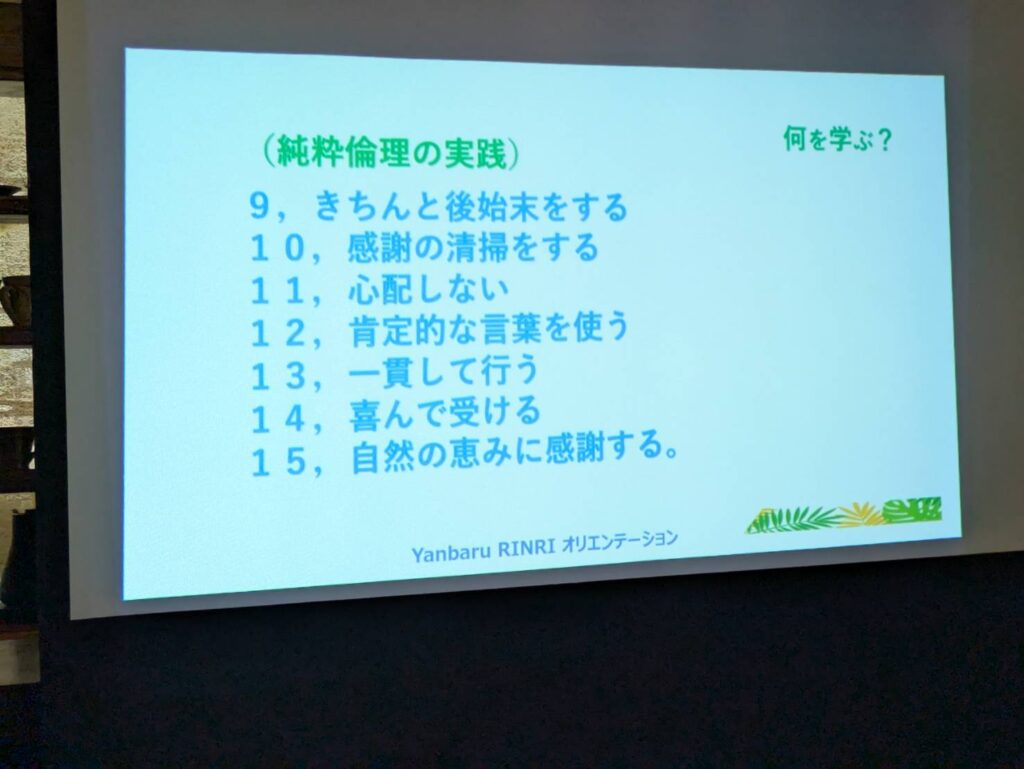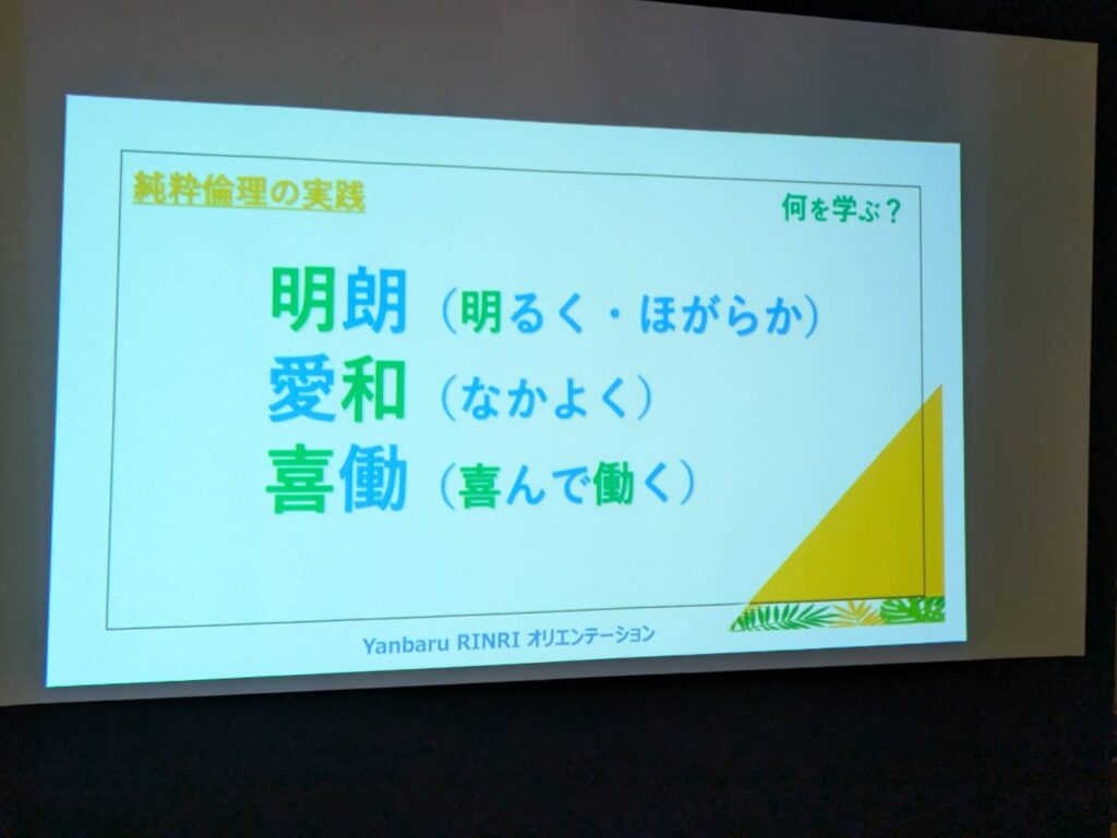 倫理法人会の概要、純粋倫理とは、など、スライドを見ながら、基本的なことを比嘉直紀相談役を講師に学びました。
